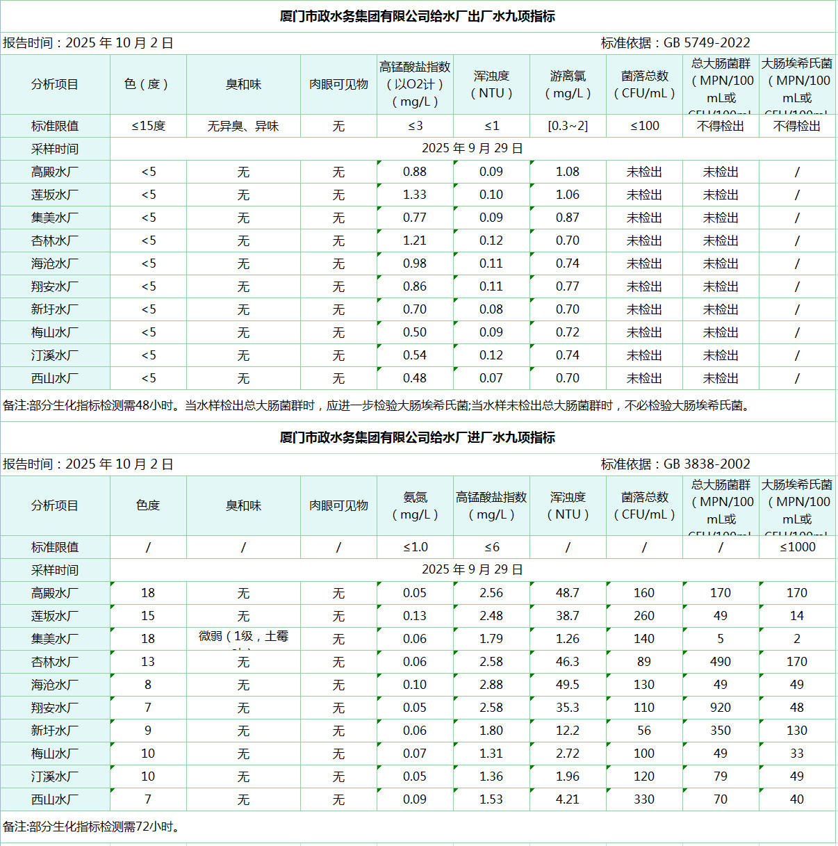 2025年9月29日新濠博亚娱乐 给水水厂水质信息公布