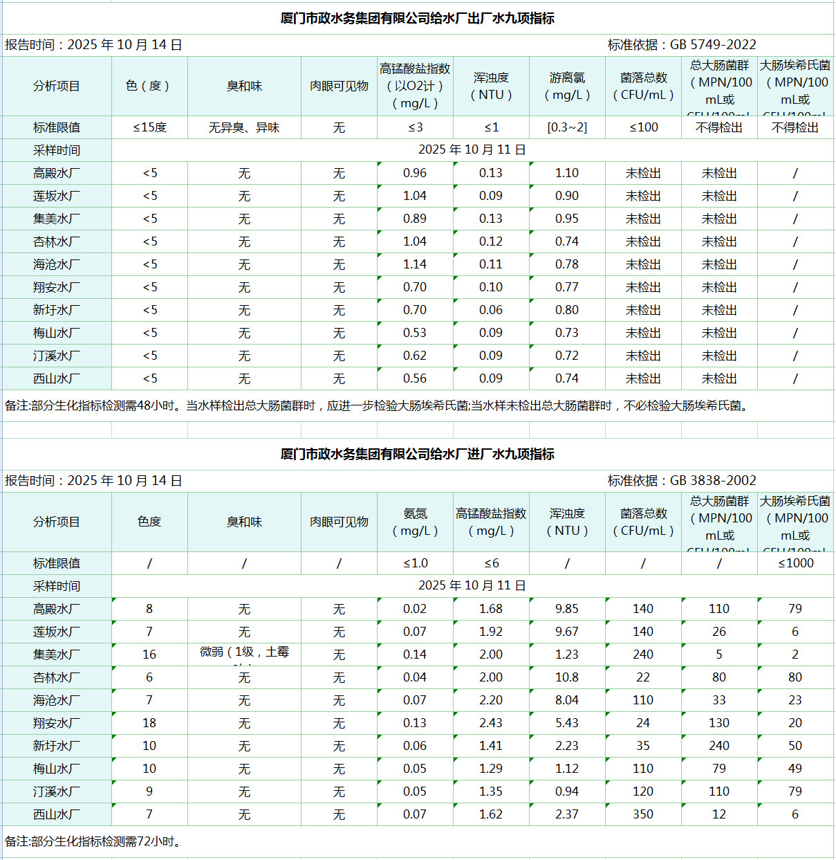 2025年10月11日新濠博亚娱乐 给水水厂水质信息公布